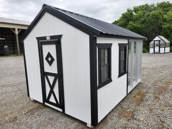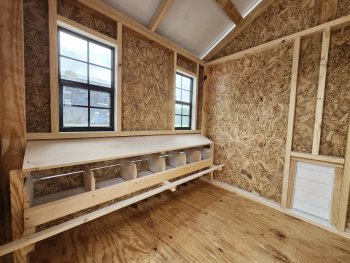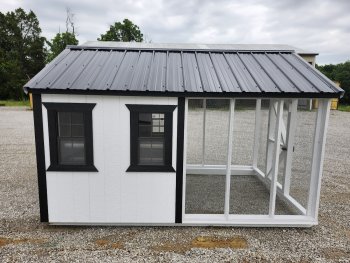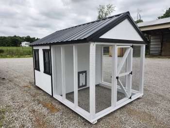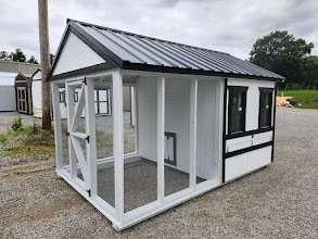 Has an attached chicken run with ramp door access to the roost/nesting area. 6 nesting boxes with exterior access door.