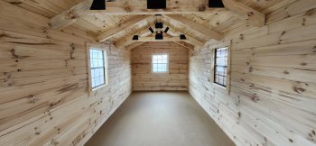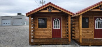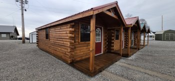 New Log Cabin. Rustic Cedar Stain with red roof and door.
