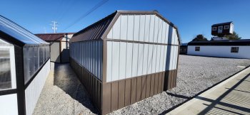 New Metal Bargain Barn. Light gray with a burnished slate roof, wainscoting, and trim.