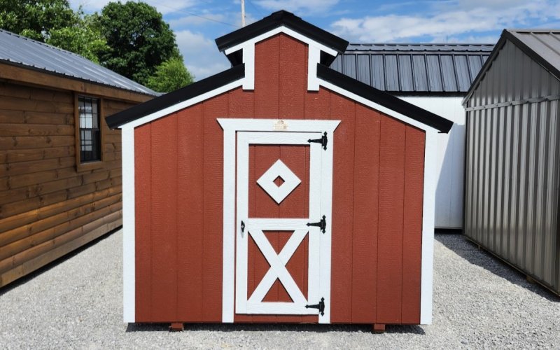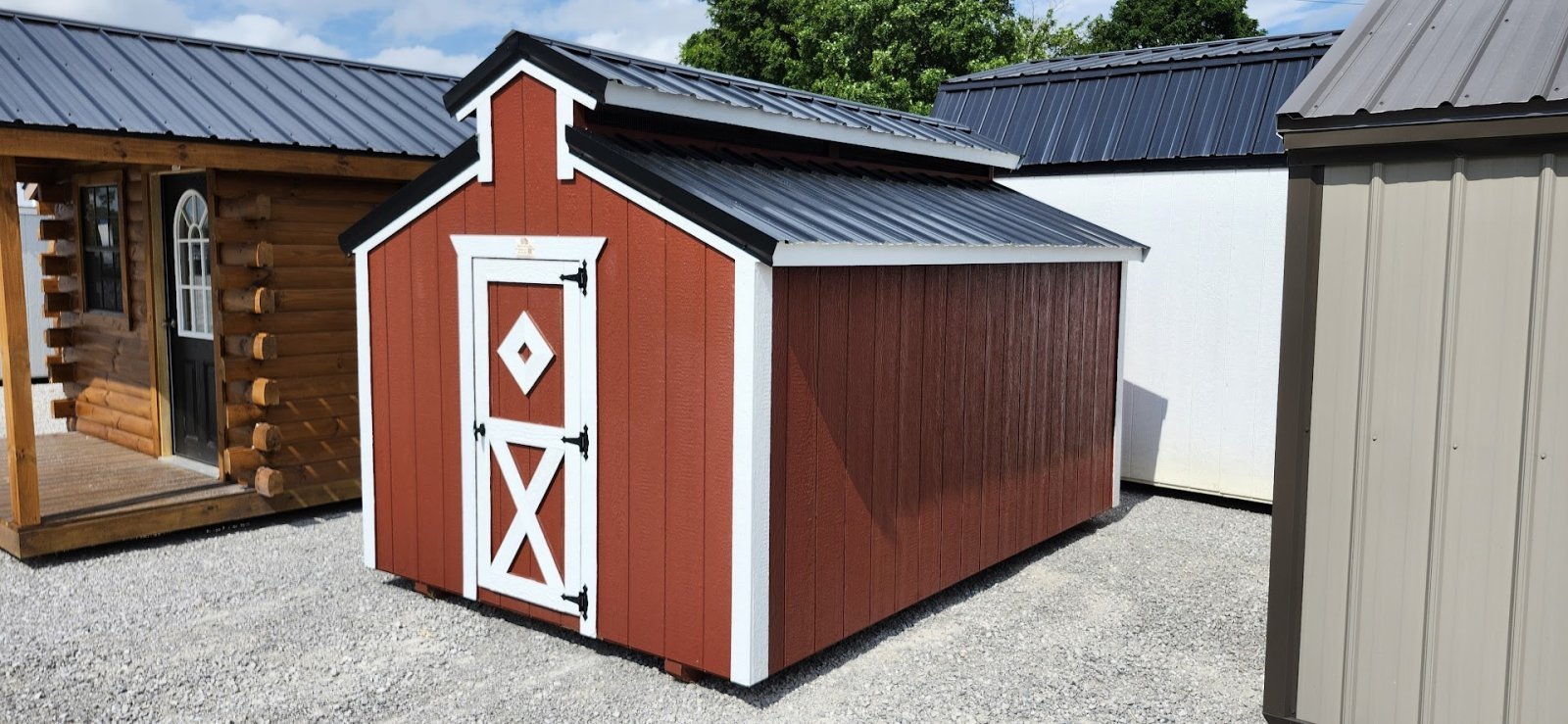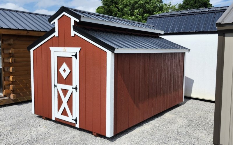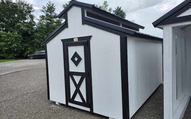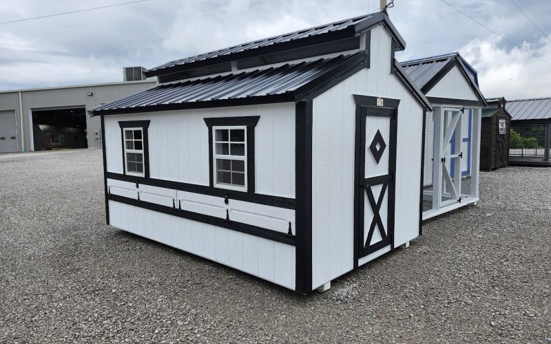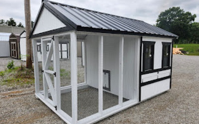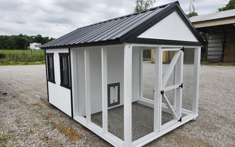 Has an attached chicken run with ramp door access to the roost/nesting area. 6 nesting boxes with exterior access door.