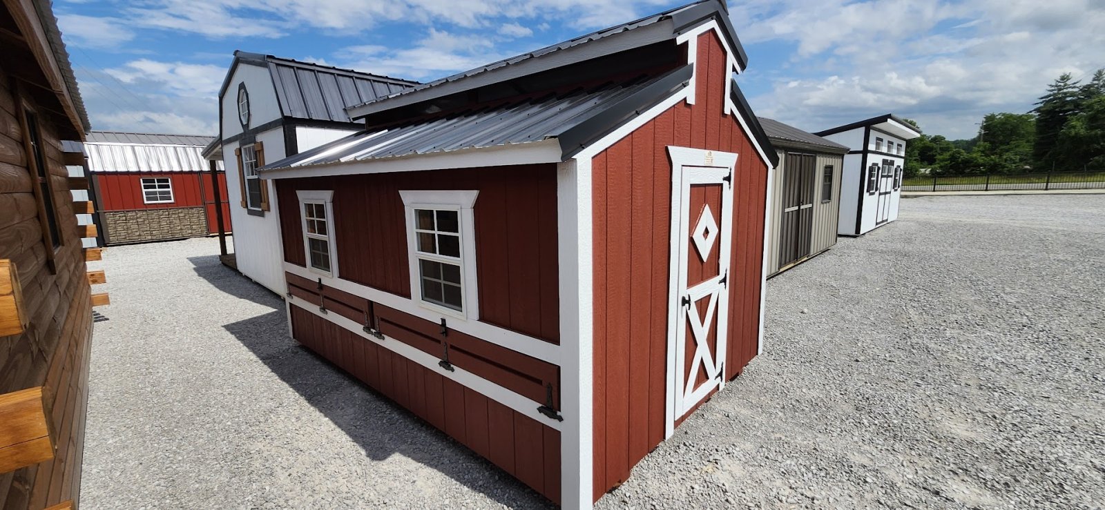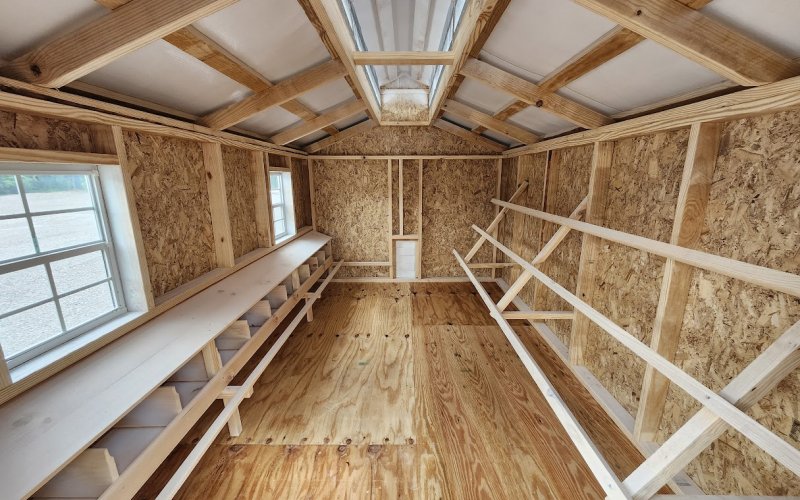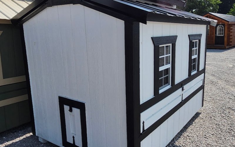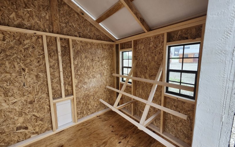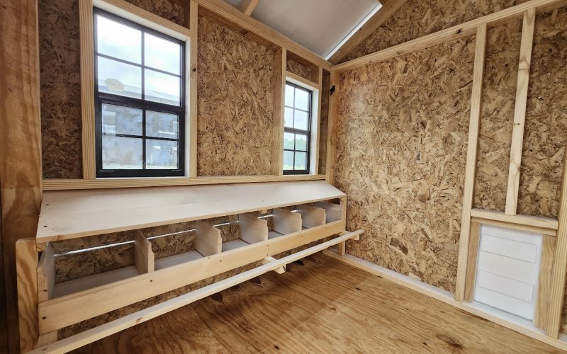 12 Nesting boxes with exterior door access 3 rows of roosting bars Chicken ramp 2 small windows